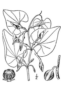 The plant has dirty yellow flowers, usually in axillary groups of 7. Each flower is up to 1 inch in diameter and has a straight funnel-shaped tube with pointed, curved upper lips. The perigone forms a straight tube, which is bulbous beneath and has a linguiform, oblong-ovate, obtuse border. There are 6 stamens, the style is upward growing, and the stigma is 6-lobed. The flower briefly traps the insects that pollinate it. It has foul smelling. Flowering normally takes place from Jul to September. The plant seeks light by ascending the stems of surrounding plants. Flowers are pollinated by certain tiny insects. Each pollinated flower is followed by green, pear-shaped fruit that has the size of a nut and opens up in six flaps containing flat, triangular seeds.
