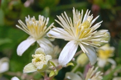 The flowers are white to greenish-white, and they are about 2 cm in diameter. The inflorescence of C. vitalba is a terminal axillary panicle – the flowers are found in stalked clusters of the upper leaf axils. Each individual flower is perfect; they contain both male and female flower structures (stamens and pistils). The flowers do not have petals and are composed of 4 sepals, many stamens and many styles. Some stamens can be non-fertile, and some are petaloid. The styles are plumose (feathery), and they are long, white and persistent. Flowering normally takes in between July to September.