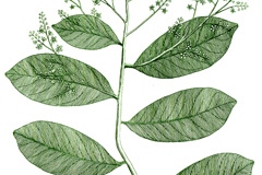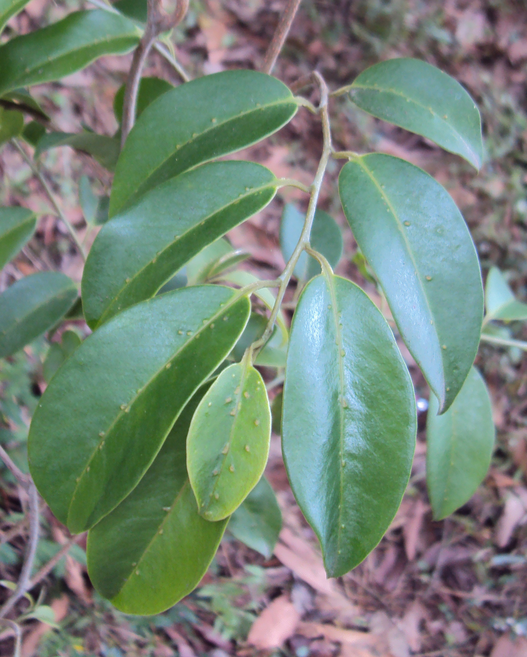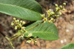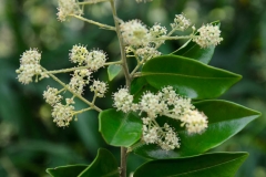 False Black Pepper is a straggling shrub with long, slender, flexible and terete branches that have long internodes. Leaves are elliptic or elliptic lanceolate, glabrous on both side, shining above and silvery beneath. Petioles are glabrous, more or less margined and 6-16 mm long. Flowers are small, numerous, pentamerous, in lax panicled racemes which are terminal. Calyx is 1.25 mm long, sepals are ciliate, broadly triangular-ovate and petals are greenish yellow, elliptic, subobtuse, 4 mm long and pubescent on both sides. Flowers are followed by globose berries which are smooth, succulent, about 3-4 mm diameter and black when ripened. Berries enclose a reddish and horny seed which is depressed at the base with ruminated endosperm. The fruit has aromatic, astringent with slight pungency taste.