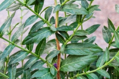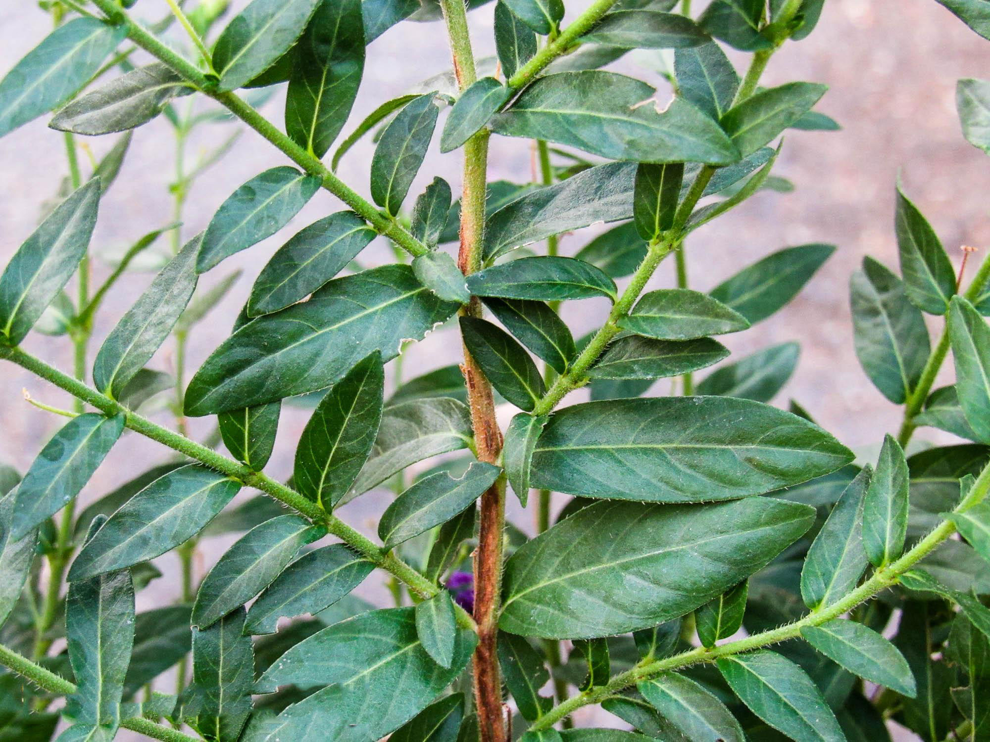Leaves are simple, subsessile (with slight stalks), opposite, pinnately-veined, oblong, sometimes elliptic, glossy, medium to dark green, 10 to 30 mm long and 1.5 to 4 mm wide, with pubescent (covered with hair) undersides. They are arranged alternately in the length of the stems giving the plant a fernlike appearance. They are glabrous or almost glabrous on the upper surface, the lower midrib or the leaf margins are sometimes strigous, the base is rounded to acute or attenuated. The apex is acute, rare once obtuse. Petiole is up to 2 mm or absent; upper stem leaves not reduced.