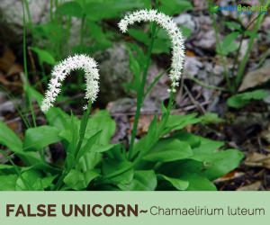 False Unicorn is an herbaceous dioecious perennial herb that grows about 30-100cm tall. Female stalks tend to be taller, giving a total maximum plant height of about 1.2 m, but also tend to have about ten times fewer flowers. It grows in a variety of habitats, including moist slopes, bottomlands, wet savannas, dry woods, barrens, and bluffs, typically absent from the eastern coastal plains. It also thrives in open woods and relatively open calcareous wet meadows. It prefers moist, well drained and acidic soil with high humus content. Stem is 1 to 3 feet high, simple, smooth, angular. Leaves are alternate, spatulate below, lanceolate above, radical leaves, 8 inches long, 1/2 inch wide, narrow at base and formed into a whorl.