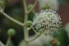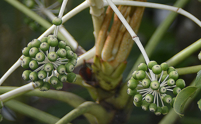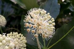 Terminal panicle is 20-40 cm long. Inflorescences are 3-5cm in diameter, rachis brownish tomentose; Calyx is sub entire, glabrous. Japanese aralia has 5 petals that are ovate-triangular, 2.5 – 3 mm long, yellow-white and glabrous. It has 5 stamens, filaments equal to petals length. Ovary is inferior, 5-locule, with 1 blastomere in each locule. It has 5 styles, detached; Disk is convex semicircle. They appear in October to November and last for several weeks.