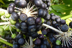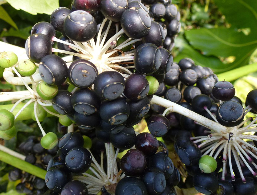 Fertile flowers are followed by sub globose pea-shaped berries that are nearly 5 mm in diameter. These berries are initially green maturing to shiny black berries during early to mid-winter in the Upstate and mid to late winter along the coast. Berries last well on the plants, unless eaten by birds. Hard freezes will eventually cause the berry clusters to collapse.