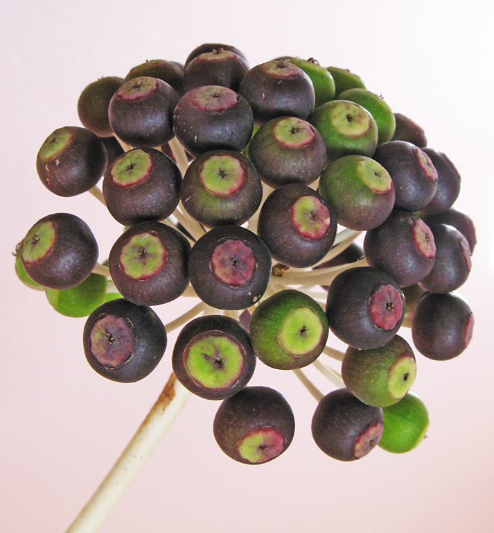 | Colors | Initially green maturing to shiny black berries |