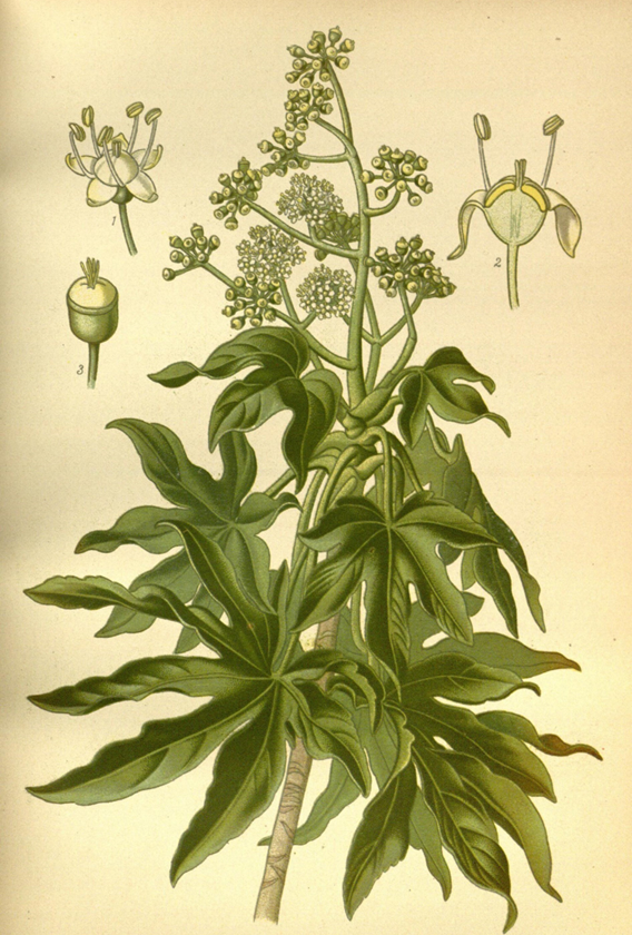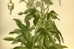 Leaves are large, leathery, sub-orbicular varying in size according to the size and vigor of the plant, normally 12-30 cm in diameter, palmately 7-9 deeply lobed, with a broad heart-shaped base. The lobes reach more than half-way to the base, ovate, coarsely and bluntly toothed except towards the base, where the opening between the lobes is wide and rounded. Upper surface is dark shining green while the lower one is lighter, granular pro-tuberance, both quite glabrous, margin occasionally golden yellow. Lateral pulse bulges on both sides, reticulate veins slightly prominent below. Petiole is round, stout, smooth, often 1 ft. or more long.