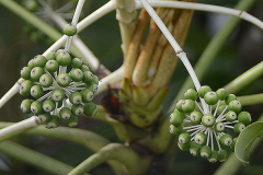 | Flower | Terminal panicle is 20-40 cm long. Inflorescences are 3-5cm in diameter, rachis brownish tomentose; Calyx is sub entire, glabrous. Japanese aralia has 5 petals that are ovate-triangular, 2.5 – 3 mm long, yellow-white and glabrous. It has 5 stamens, filaments equal to petals length. |