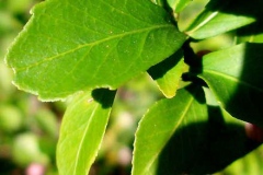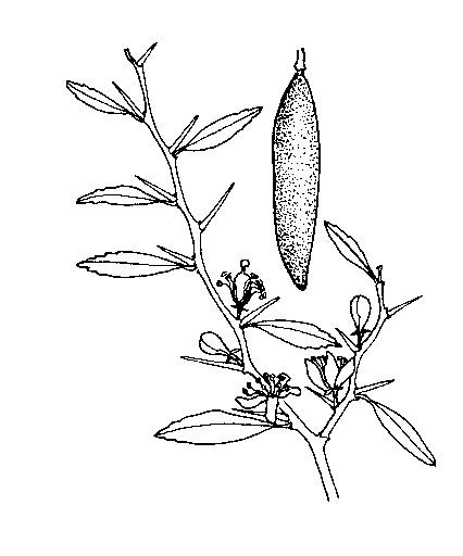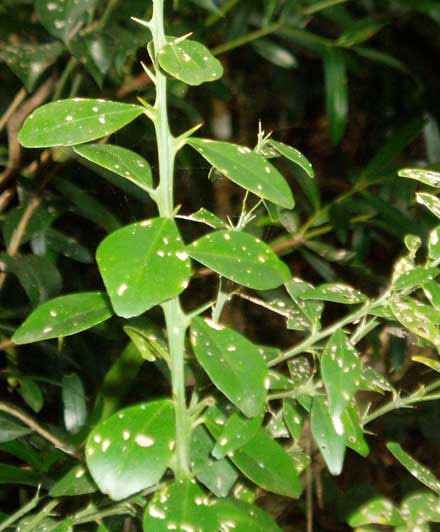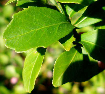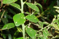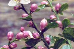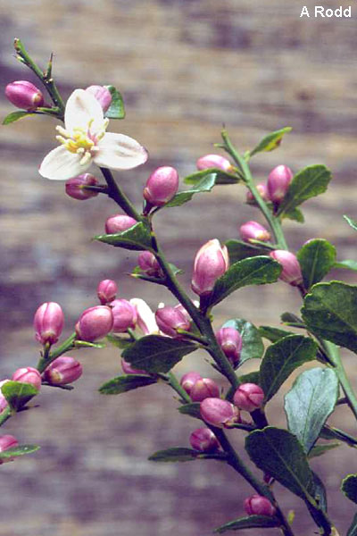 Leaves are small, glabrous, obovate to elliptic or more or less rhombic, 1–5 cm long by 3–25 mm wide, with notched apex, cuneate base, margins often crenate towards apex, oil glands numerous, aromatic when crushed and borne on 1–3 mm wingless petioles. New growth is purple in color and the one-quarter inch wide.