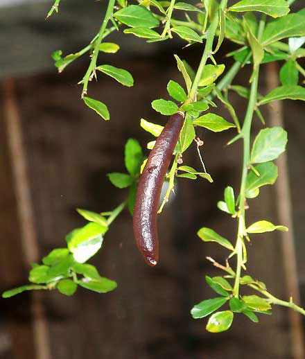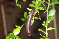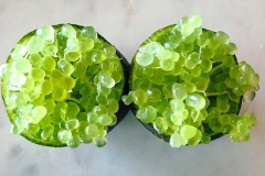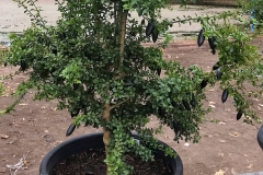 Fertile flowers are followed by cylindrical, fusiform, finger-shaped, 4–8 cm (1.6–3.1 in) long and roughly the size of an average person’s index finger and sometimes slightly curved. The skin of the finger lime is usually a greenish black to very dark purple and thin, but durable. Once the fruit is cut open the tiny round juice vesicles will slowly seep out of the fruit without squeezing, and resemble what we like to call “citrus caviar”. The round vesicles are usually a clear-green, but can be very light pink. The juice is very tart, much like a Mexican lime. Although the tree produces fruit year round, the main fruiting season in California is November-December when the fruit falls off in your hand. Australian finger lime is reported to fetch approximately 40-50 dollars per pound. The fruits are technically edible, but this is not commonly done. Its most common use is as a garnish or flavor component in culinary creations. Since it is very sour and is probably best used for cooking, jams, garnishes, sauces and drinks.