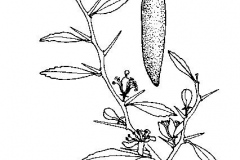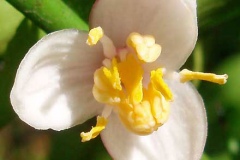 Flowers buds are small and pink in color on short peduncles 1–3 mm long. The flowers are bisexual and have 6–9 mm long white oblong petals, short 1.5 mm long, free concave sepals and numerous stamens (20–25) with white filaments and yellow anthers, stout ovary with 5–7 locules with 8–16 ovules in each locule. Flowers are white and pink during the main flowering season of February to April.
