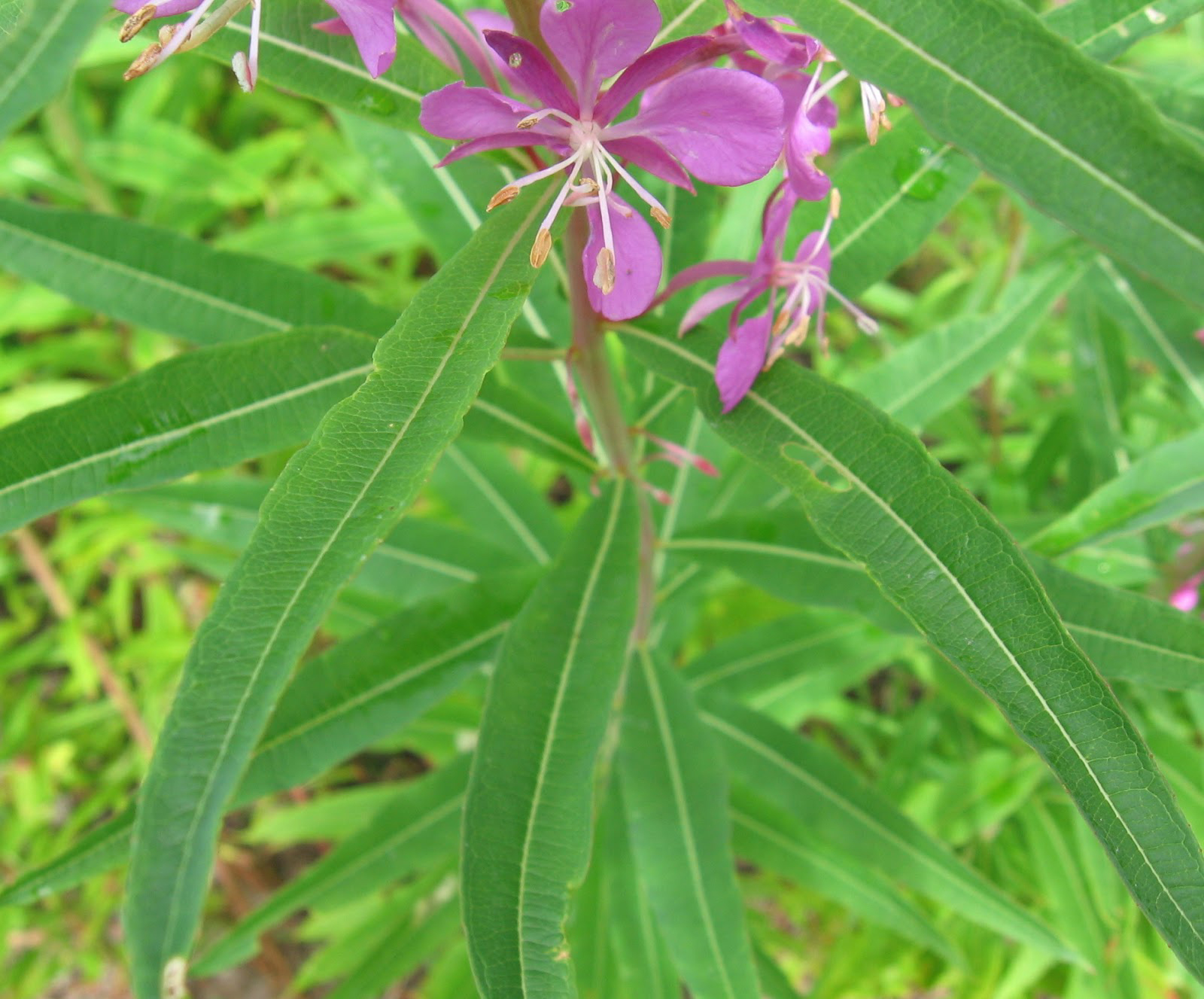 Normally leaves are alternate, arching to ascending, lanceolate, pointed, hairless, becoming smaller at top of stem, 3-8 in (7.5-20 cm) long, to 0.75 in (2 cm) wide; little or no stalk and are dark green above and silvery below. Flowers are rose to purple, rarely white, with 4 petals 8-20 mm long. Numerous flowers in terminal greatly elongate clusters, lower flowers blooming first. Sepals are 8-12 mm long with style 1-2 cm long, longer than the 8 stamens, softly long- hairy on the lower portion, stigma 4-cleft. Flowering normally starts from June to September. Fruits are long, very narrow pod, gray-hairy, 2-3 in (5-7.5 cm) long, and held upright; peeling open length-wise to release thousands of small hairy-tufted seeds. Numerous minute brown seeds are present with a tuft of silky, white hairs at the tip.