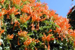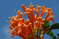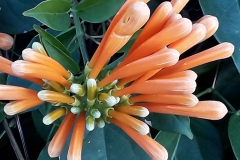 Orange Trumpet Creeper is a floriferous climber that flowers almost continuously throughout the year in the tropics, and in the subtropics from late fall to spring, even lightly during summer. The tubular flowers are about 3 in long and borne in clusters of 15-20 at the tips of branches. Calyx is 4–7 mm long, almost entire to shallowly lobed and minutely 5-dentate. Corolla usually 5–7 cm long, orange or reddish orange; tube ± curved, very narrow at base, broadening above; lobes 10–18 mm long, margin and often upper parts of outer and/or inner surfaces hairy. The flower clusters may hang down under the weight of their own beauty. The long-lasting, brilliantly colored and attractive flowers are a magnet for hummingbirds, bumble bees and butterflies too!