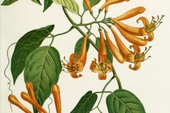 Flamevine is a vigorous, fast-growing, evergreen woody flowering vine that normally grows about 5-7 m tall. The plant can spread quickly by tendrils to the top of whatever supports it, including fences, other plants or even small buildings by branching profusely and climbing using its clinging tendrils. The plant is found growing in rocky places, forests in seasonally dry areas and scrub. The plant prefers compost enriched, light and moist, but well-drained soil. It tolerates several kinds of soils: acidic, alkaline, clayey, sandy or loamy, but is intolerant of saline soils. Stems are angular to sub-cylindrical, striate, puberulent or lepidote, interpetiolar zone not glandular; cross section of the mature stem with peripheral phloem tissue not forming a cross. Flame Vine has been listed as possibly invasive in some regions as it can easily regrow from its roots even if damaged above ground.