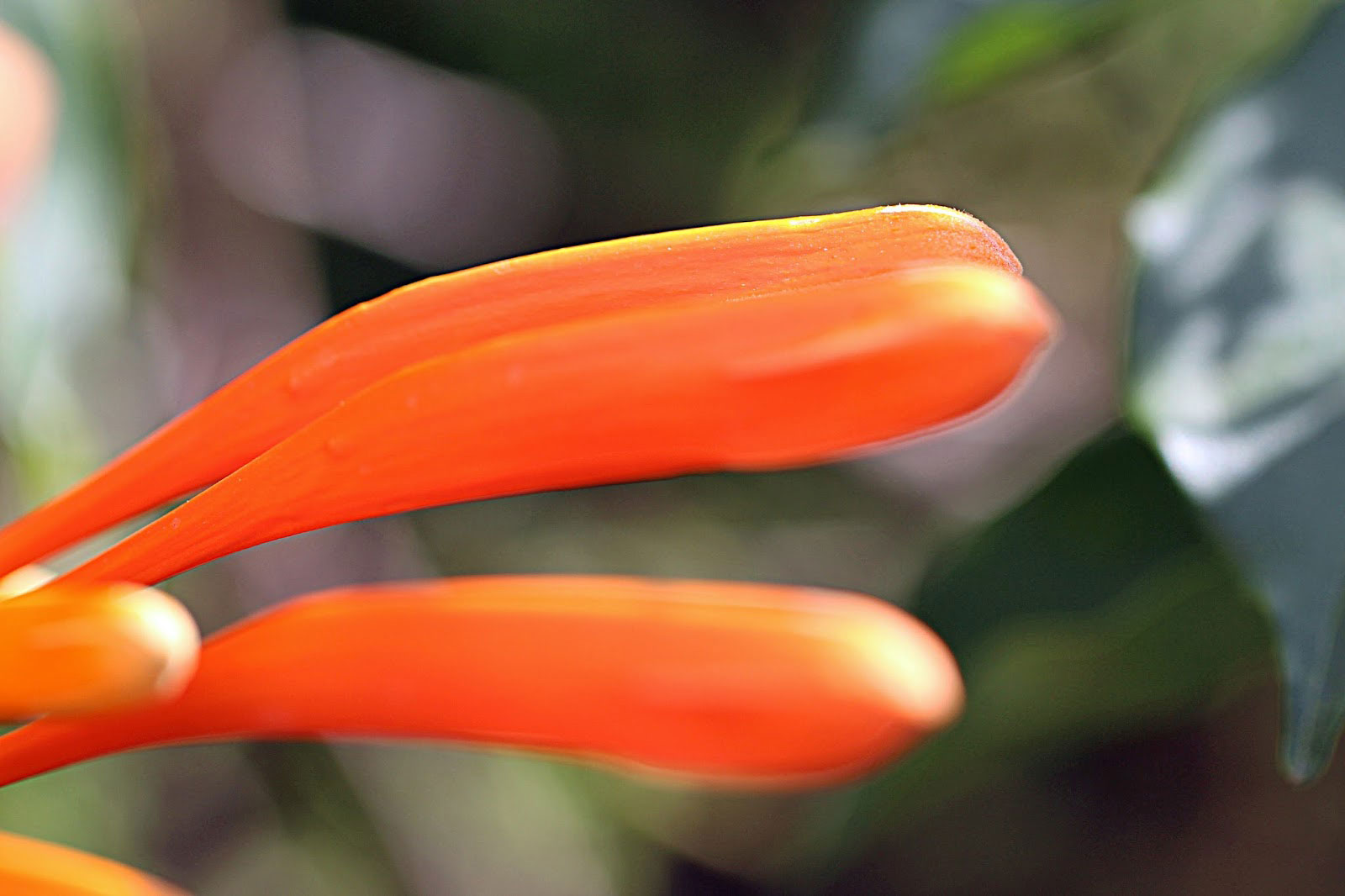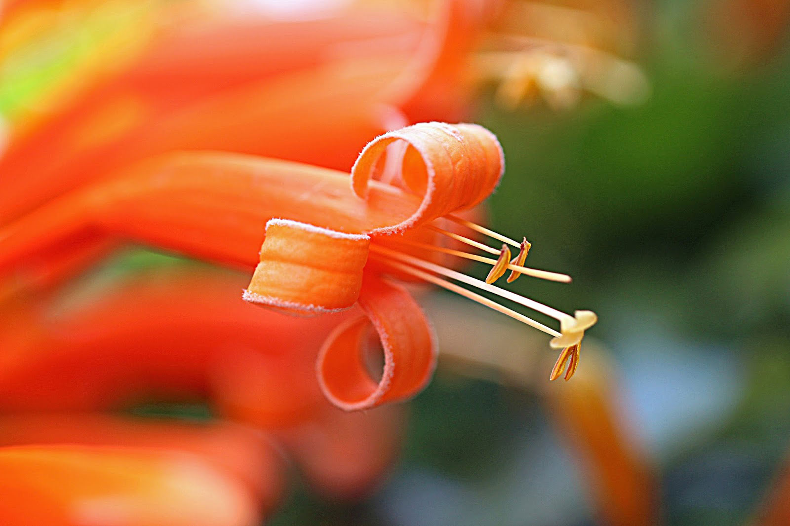 Orange Trumpet Creeper is a floriferous climber that flowers almost continuously throughout the year in the tropics, and in the subtropics from late fall to spring, even lightly during summer. The tubular flowers are about 3 in long and borne in clusters of 15-20 at the tips of branches. Calyx is 4–7 mm long, almost entire to shallowly lobed and minutely 5-dentate. Corolla usually 5–7 cm long, orange or reddish orange; tube ± curved, very narrow at base, broadening above; lobes 10–18 mm long, margin and often upper parts of outer and/or inner surfaces hairy. The flower clusters may hang down under the weight of their own beauty. The long-lasting, brilliantly colored and attractive flowers are a magnet for hummingbirds, bumble bees and butterflies too!