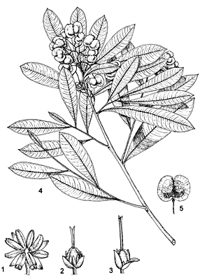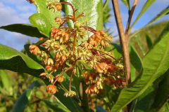 Inflorescence is a loose thyrsoid panicle at the end of twigs. The flowers are yellow to orange-red and produced in panicles about 2.5 cm (0.98 in) in length. The flowers may be bisexual or unisexual, and one plant bears either male or female flowers. However, sometimes they are observed to bear flowers of both sexes. The pollen is transported by anemophily. Sepals 3–4, free, 2–2.5 mm long; petals absent; stamens 7(–9), filaments very short, anthers oblong, up to 3 mm long in male flowers, up to 2 mm long in bisexual flowers and reduced to staminodes or completely lacking in female flowers; ovary superior, oblong in outline, flattened, 2–3-celled, strongly rudimentary in male flowers, style 2–3-lobed. It is believed that the flowers lack petals during evolution to increase exposure to the wind. Flowering normally takes place in between February to October while August to November in Florida.