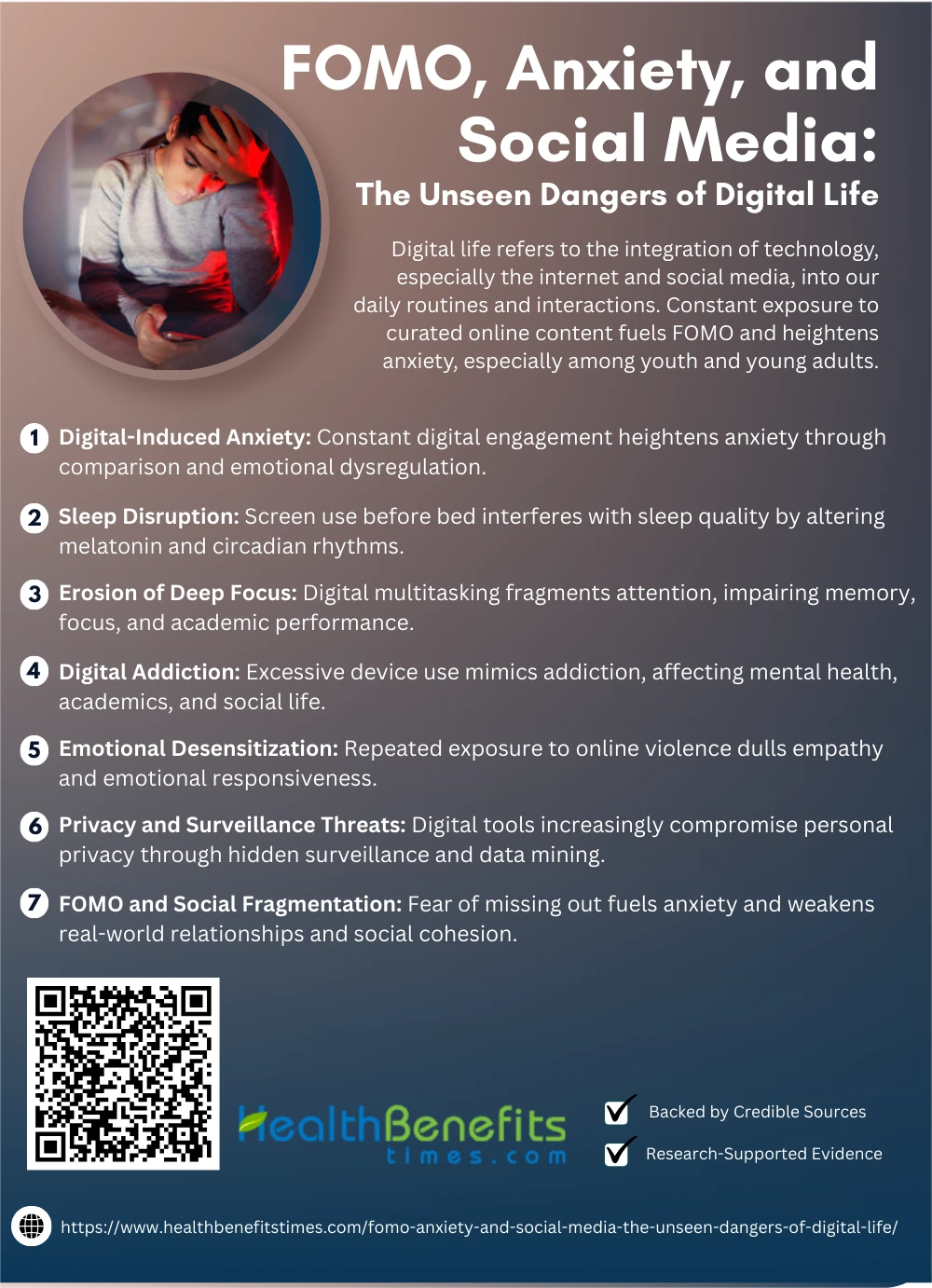 Digital life refers to the increasingly immersive and interconnected existence people lead through digital technologies, where social, personal, and professional interactions are mediated via the internet, devices, and apps. As social media continues to dominate the digital ecosystem, its influence on mental well-being has become a growing concern. Platforms like Instagram, TikTok, and Facebook are not just tools for communication—they are psychological landscapes where users constantly encounter curated representations of others’ lives. This often gives rise to, a pervasive feeling of anxiety over the possibility of missing rewarding experiences others seem to be having. Research has shown that individuals with higher levels of FOMO are more likely to engage in excessive social media usage, leading to greater psychological stress and emotional dys-regulation. Moreover, algorithms that amplify engagement by promoting emotionally charged or comparison-inducing content further aggravate anxiety levels, especially in adolescents and young adults. Ultimately, while social media offers connection, it also subtly undermines users’ mental stability, driving a cycle of validation-seeking behavior and emotional fatigue.