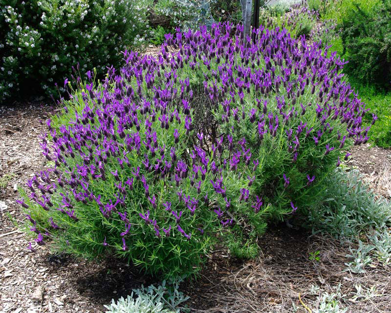 French lavender is a low-growing but mostly upright, erect, evergreen, perennial shrub that normally grows less than 60 cm tall, but occasionally reaching up to 1 m in height. The plant is found growing in dry hills, garrigue, maquis shrub land, open woodlands, pastures, roadsides, disturbed sites, gardens, waste areas, waterways, mallee scrublands, lowland grasslands and disturbed grassy woodlands. The plant needs fast-draining, nutrient-poor, alkaline soil. Occasional pruning will help keep this lavender clean and blooming. The plant prefers poor soil conditions; it does not grow well in nutrient-rich, fertile soils. Gravel mulch is a great option for topping the soil around French lavender.