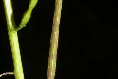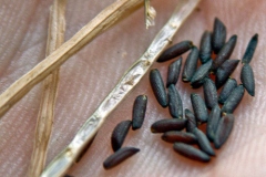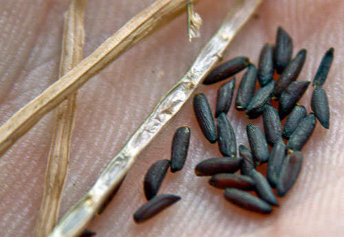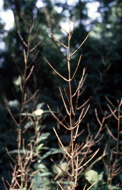 Fertile flowers are replaced by narrow seedpods that are called “siliques.” These seedpods are linear, 2.5 to 6.0 cm long and about 2 mm wide and are narrowly cylindrical. A single plant can produce two to over four hundred fruits (with an average of twenty-two per plant). The fruits ripen between mid-June and September. Fruits are initially green maturing to pale grey brown. Each fruit contains approximately sixteen seeds. Seeds are black, cylindrical about 3 mm long and 1 mm wide and transversely ridged, and range in weight from 1.62-2.84 mg. A single plant is capable of producing up to 8000 seeds in a single season! Seeds are contained in tan seedpods that are capable of ejecting the ripened seeds several feet away from the stem of the plant. Seeds must lay dormant for at least one year before germinating in the spring. Cold stratification is required to trigger seed germination. The seeds can remain viable in the soil for up to five years (a factor that further complicates the removal of an established garlic mustard population). Seeds can be transported great distances on boots of hikers or even on the tires of vehicles.
