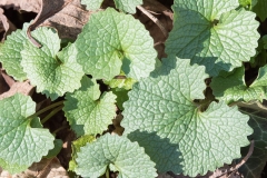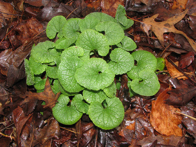 The leaves of 1st year plants are up to 2 inches long and across. They are cordate-orbicular with margins that are dentate or wavy and their upper surface has a reticulated network of veins. The petioles of these basal leaves are rather long and slender. The alternate leaves of 2nd year plants have a similar appearance, except that they are usually longer than wide, spanning up to 3 inches long and 2 inches across. The lower and middle leaves along the stems are usually cordate with either acute or blunt tips, while the upper leaves are often ovate. Both the stems and petioles of 2nd year plants are occasionally hairy, otherwise they are glabrous like the blades of the leaves. The foliage is often light green or yellowish green in appearance, otherwise it is medium green. New leaves produce a distinct garlic odor when crushed. The fragrance fades as leaves age, and is virtually non-existent by fall.