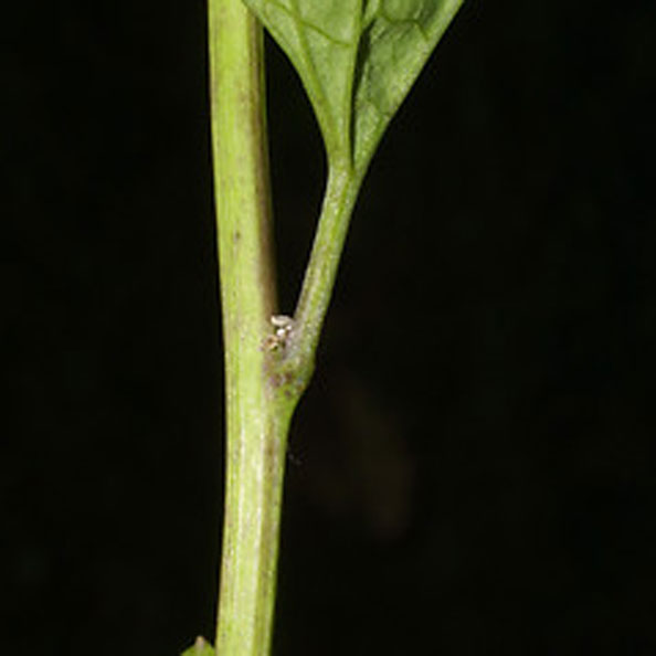 | Leaf | Stalked, triangular through heart shaped, 10–15 cm (3.9–5.9 in) long (of which about half being the petiole) and 5–9 cm (2.0–3.5 in) broad, with coarsely toothed margins |
