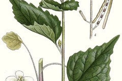 | Name in Other Languages | Albanian: Bar hadhre, bar hudhre, barëhudhëre mjekësore Arabic: thawmiat mueanaqa (ثومية معنقة), samarat thawmia (سمارة ثومية) Armenian: Skhtorabuys deghatu (Սխտորաբույս դեղատու) Basque: Baratxuri-belar, apo-baratxuri, baracaiz bedarra, sorgin-baratxuri Belarusian: Časnočnica čarankovaja (Часночніца чаранковая) Bokmal: Laukurt, Løkurt Bulgarian: Lŭzhichina (лъжичина), lechebna lŭzhichina (лечебна лъжичина), chesnova treva (чеснова трева) Catalan: Allenc, alliària Chinese: Cōng gài shǔ (葱芥属) Croatian: Češnjevka, ljekovita češnjača Czech: Cesnáček lékařský Danish: Løgkarse, Almindelig Løgkarse Dutch: Look-zonder-look English: Garlic-root, garlicwort, hedge-garlic, Jack-by-the-hedge, Jack-in-the-bush, mustard-root, poor-man’s-mustard, sauce-alone, garlic mustard plant Esperanto: Oficina aliario Estonian: Salukodrik Finnish: Litulaukka French: Alliaire, Alliaire officinale, Herbe à Ail, alliaire petiole, herbe aux aulx, julienne alliaire, vélar alliaire Gaelic: Gàirleach-callaid German: Gewöhnliche Knoblauchsrauke, Knoblauchsrauke, Knoblauchhederich, Knoblauchskraut, Knoblauchrauke, Lauchhederich, Lauchkraut, gemeine Knoblauchsrauke, gemeines Lauchkraut, Knoblauchkresse, Knoblauchskresse, Lauchel Greek: Alliára (αλλιάρα), alliaría farmakeftikí (αλλιαρία φαρμακευτική) Hebrew: Ali’aryah shumit, אָלִיאַרְיָה שׁוּמִית Hungarian: Kányazsombor Irish: Bóchoinneal Italian: Alliaria commune, Alliaria, Erba alliaria, rimandria Korean: Ma neul naeng I (마늘냉이) Latvian: Dziedniecibas kiplocene, ārstniecības ķiplocene Limburgan: Look zonder look, Look zoonder look, Louk zónger louk, Lithuanian: Vaistinė česnakūnė, Česnakūnė Luxembourgish: Bloderkraut Netherlands: Netherlands: Look-zonder-look Norwegian: Laukurt Persian: گندنایی Polish: Czosnaczek Pospolity, Czosnaczek Portuguese: Lunaria biënnis, erva alheira, aliária, erva-dos-alhos Romanian: Aişoară, ustroiță pețiolată, usturoiță, vindecătoare Russian: Chesnochnik lekarstvennyy (Чесночник лекарственный), Chesnochnitsa chereshkovaya (Чесночница черешковая), chesnochnik chereshkovyĭ (чесночник черешковый) Serbian: Lukovac (луковац), obična češnjača (обична чешњача) Slovak: Cesnačka lekárska, rancesnak lekársky Slovene: Cesnovka Spanish: Ajera, Aliaria, hierba ajera, hierba de ajo, hierba del ajo, hoja del gañán, yerba de ajo, yerba del ajo, yerba que huele a ajos, zancaraña, Ajo mostaza, ajo mostava Swedish: Löktrav, Vitlöksört Turkish: Sarmısak out, sarımsak hardalı Ukrainian: Kinsʹkyy chasnyk chereshkovyy (Кінський часник черешковий), kinsʹkyy chasnyk likarsʹkyy (кінський часник лікарський) Walloon: A des håyes Welsh: Garlleg y berth |