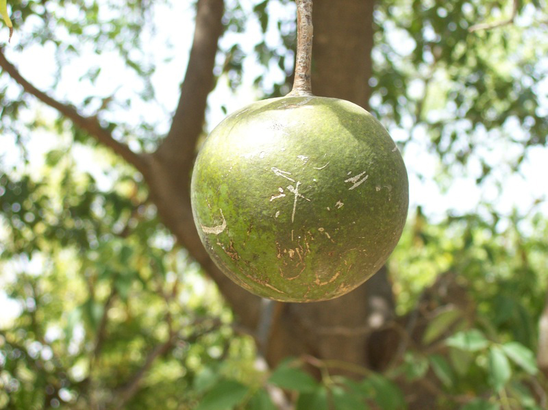 Garlic pears are rounded or ovoid shaped fruit, and are 3 to 5 centimeters in diameters. The fruit has hard and rough rind and has unpleasant smell and burning taste. The seeds are about 10 centimeters in length, numerous, kidney-shaped, and embedded in a yellow pulp. Tree flowers and fruits in the month of Dec-May