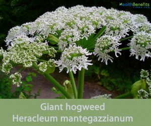 Genus name comes from a variant of the Greek words herakleia or panakes herakleion in honor of Hercules (Gr. Herakles). The species name mantegazzianum refers to Paolo Mantegazza (1831–1910), Italian traveller and anthropologist. Sap of giant hogweed is phototoxic and causes phyto photo dermatitis in humans, resulting in blisters and scars. These serious reactions are due to the furanocoumarin derivatives in the leaves, roots, stems, flowers, and seeds of the plant. Thus, it is considered to be a noxious weed in many jurisdictions.