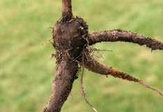 Plant produces thick, branched taproot and tightly clustered, fibrous roots. Roots extend 18 to 24 inches (45-60 cm) deep. Lateral roots are often finer than vertical roots. Root’s thickness and branching increase with plant age and result in a multi-taproot system. Root crown can grow to 6 inches (15 cm) in diameter and becomes lignified when giant hogweed reaches flowering age. Root crowns are often found up to 5 inches (12 cm) below ground. Root crowns have contraction rings capable of shrinking the area between the crown and the shoot and protecting the hypocotyl from extreme temperatures.