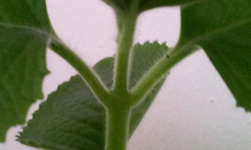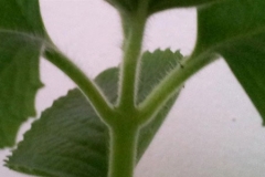 Stem Green stems are  3–8 cm (1–3 in) in diameter, occasionally up to 10 cm (4 in) in diameter, with dark reddish-purple splotches and coarse white hairs at the base of the leaf stalk