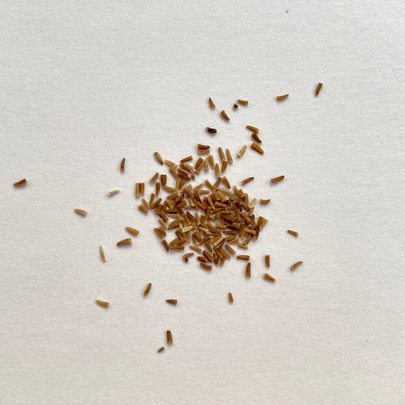 Fertile flowers are followed by dry schizocarps consisting of two mericarp seeds 6-18 mm long, 4-10 mm wide and about 1 mm thick, which are joined until ripening. Mericarps are elliptical, flattened, and emarginated at the apex with thin low dorsal ridges and broadly winged lateral ridges. It is tan in color with brown lines (so-called oil tubes) extending 3/4 of the length of the seed. The endosperm is oily and mature fruits have a strong resinous smell
