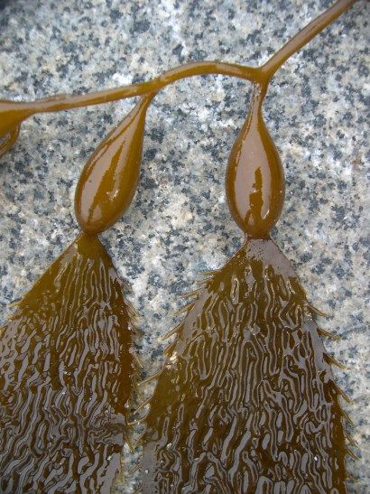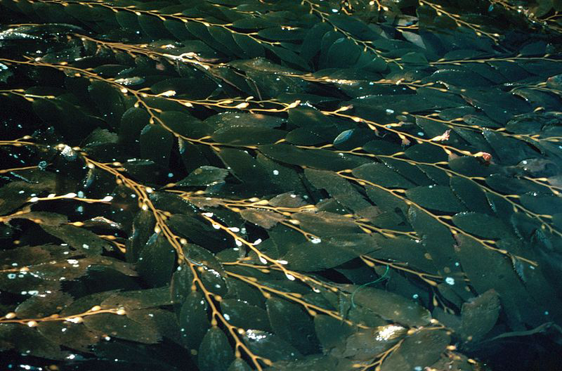 Macrocystis pyrifera, with many common names including Giant kelp, kelp, giant bladder kelp, Pacific kelp and brown kelp is actually a species of kelp (large brown algae), and one of four species in the genus Macrocystis. The plant belongs to the family Laminariaceae, the family of brown algal seaweed. Giant kelp is common along the coast of the eastern Pacific Ocean, from Baja California north to southeast Alaska, and is also found in the southern oceans near South America, South Africa, and Australia. Individual algae may grow to more than 45 meters (148 ft.) long at a rate of as much as 2 feet (61 cm) per day. Giant kelp grows in dense stands known as kelp forests, which are home to many marine animals that depend on the algae for food or shelter. Humans harvest kelp for it is rich in iodine, potassium, and other minerals, but the primary product obtained from giant kelp is alginate. Humans also harvest this species on a limited basis for use directly as food, as it is rich in iodine, potassium, and other minerals. It can be used in cooking in many of the ways other sea vegetables are used, and particularly serves to add flavor to bean dishes.
