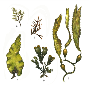 Giant Kelp is fastest-growing perennial seaweed that can grow at a rate of 2 ft. a day to reach over 40 to 65 meters (44 to 71 yards) in height in one growing season. The plant can be found growing on rocky shores of all world seas and oceans. Giant kelp grows directly upon their parent female gametophyte. To establish itself, young kelp produces one or two primary blades, and begins a basic holdfast, which serves to anchor the plant to the rocky bottom. As the kelp grows, additional blades develop from the growing tip, while the holdfast enlarges and may entirely cover the rock to which it is attached. Growth occurs with lengthening of the stipe (central stalk), and splitting of the blades. At the growing tip is a single blade, at the base of which develop small gas bladders along one side. As the bladders and stipe grow, small tears develop in the attached blade. Once the tears have completed, each bladder supports a single separate blade along the stipe, with the bladders and their blades attached at irregular intervals. Giant kelp forests support and protect many marine species such as sea urchins, sea stars, crabs and many species of fish.