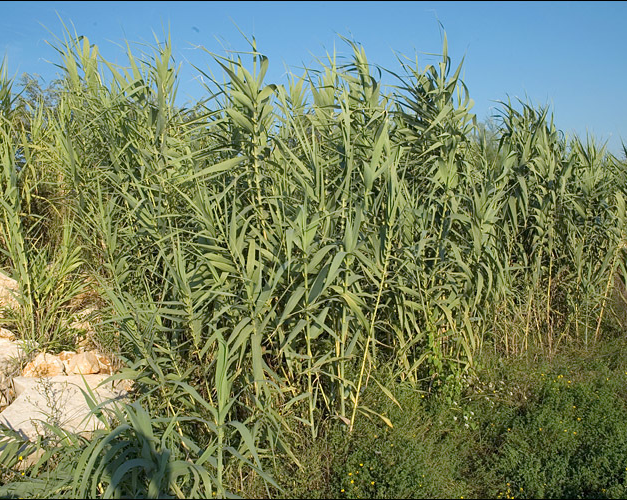 Giant reed is a tall, fast-growing, erect, herbaceous, perennial, semiaquatic rhizomatous cane or reed-like grass that normally grows about 6 meters (20 ft.) in height and in ideal conditions can exceed 10 meters (33 ft.) and a stem diameter up to 1.5 inches. It is one of the largest of the herbaceous grasses. The plant is found growing in moist areas, such as along ditches, riverbanks, hillsides, open forest, roadsides, marshland, sand dunes near seashores, lakesides, edges of stream and ponds, flood plains, coastal areas, irrigation ditches, waste ground, moist forests, shrub lands and domestic gardens. The plant grows in a wide range of soils, from coarse sands or gravelly soils to heavy clays and river sediments and from freshwater to semi-saline soils on brackish estuaries, as it has a degree of salt tolerance.