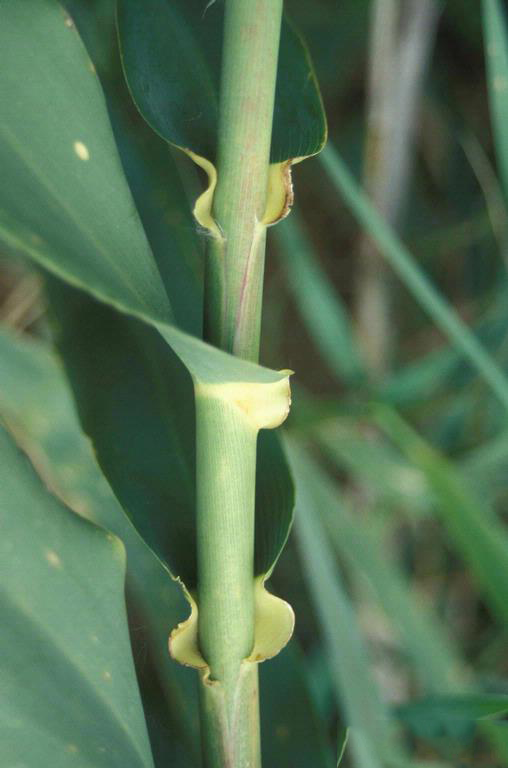 Its root structure is very strong, with the fleshy, almost bulbous, creeping rootstocks (rhizomes) forming compact bundles from which grow the fibrous roots, penetrating deep into the soil. The horizontal rhizomes give rise to many-stemmed, hollow, cane-like clumps allowing it to form large colonies many meters across. These tough, individual stems or culms are divided by partitions at the nodes like in bamboo, each node 12-30 cm in length and can reach diameters of 1-4 cm with walls 2-7 mm thick. They commonly branch during the second year of growth, rarely multiple, just single lateral branches from nodes. The outer tissue of the stem is of a silicaceous nature, hard and brittle with a smooth glossy surface that turns pale yellow when the culm is fully mature. The culms can remain green throughout the year but often fade with semi-dormancy during the winter or in droughts.