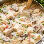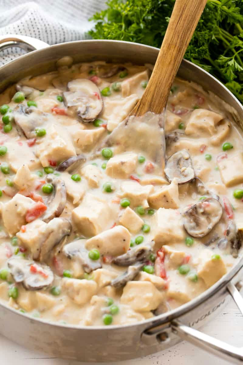 Dish of cooked chicken, sweet peppers and mushrooms in a veloute sauce.