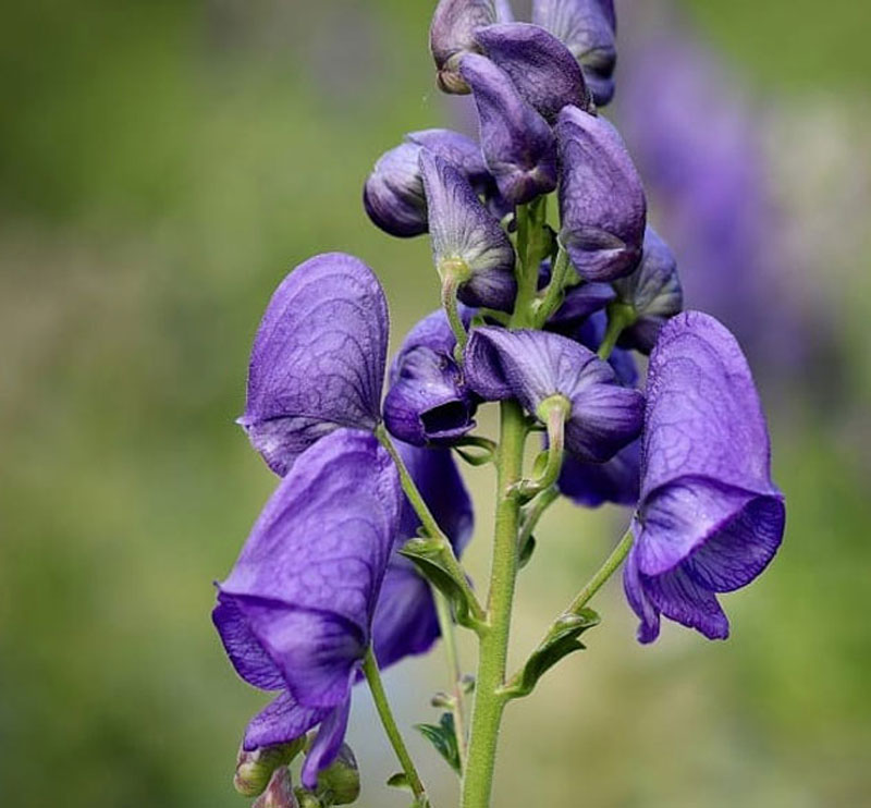 Striking bright blue flowers borne on spikes. Recognized as a poison since antiquity, it was used to poison arrows. Contains aconitine, a useful sedative for many conditions. Not to be used without medical supervision.