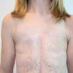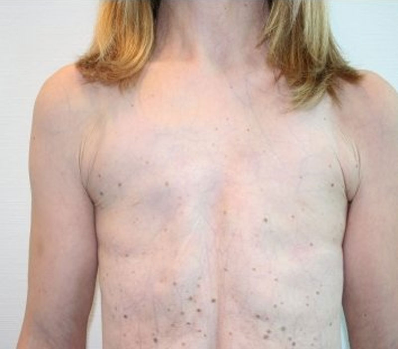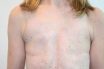 Absence of breast tissue, either as a result of a rare congenital anomaly, or more often, because of bilateral mastectomy.