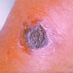 In the case of cutaneous anthrax, an elevated and itchy area develops at the point of spore entry. This area progresses to form a sizable blister, eventually transforming into a black scab while causing swelling of the surrounding tissues. During the early stages, cutaneous anthrax can be effectively treated with antibiotic medications. However, without proper treatment, the infection can spread to the lymph nodes and bloodstream, potentially leading to fatality.