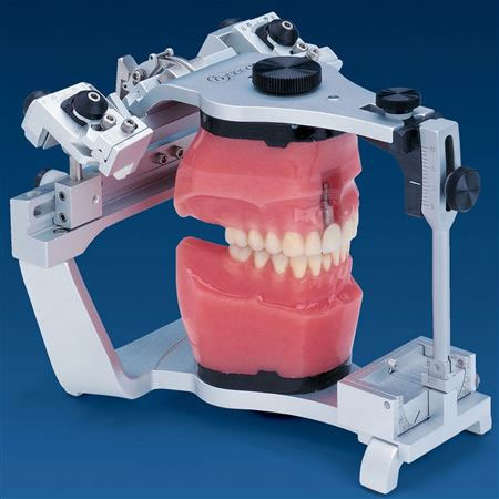 Apparatus designed to mechanically orient the essential elements of mastication (i.e., temporomandibular joints, jaws, and teeth) in their simulated spatial relationship outside the mouth. The design is based on the degree of mandibular movement simulation desired for the development of an occlusal scheme.