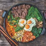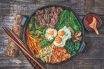 Although it sounds like a bit of scatting by Ella Fitzgerald, bibimbap is actually the name of a Korean dish which began to get noticed in North American restaurant reviews in the early 1980s. Made by filling a bowl with shredded beef, rice, and marinated vegetables, topping it with a fried egg, and then stirring it all together, the name of the dish comes from bibim, meaning mixed, and bap, meaning rice.