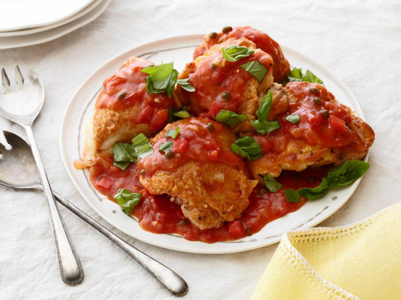 Means “hunter style,” popular American version of chicken stewed with tomatoes and/or onions, garlic, anchovies, wine and vinegar.