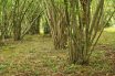 (Verb) to cut back to near ground level at regular intervals; (Noun) vegetation in which trees or shrubs are regularly cut to ground level, but resprout after cutting.