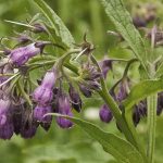 Perennial herb of the borage family with large, broad leaves and purple blooms. Comfrey also known as Knitback. Comfrey also known as Symphytum officinale.