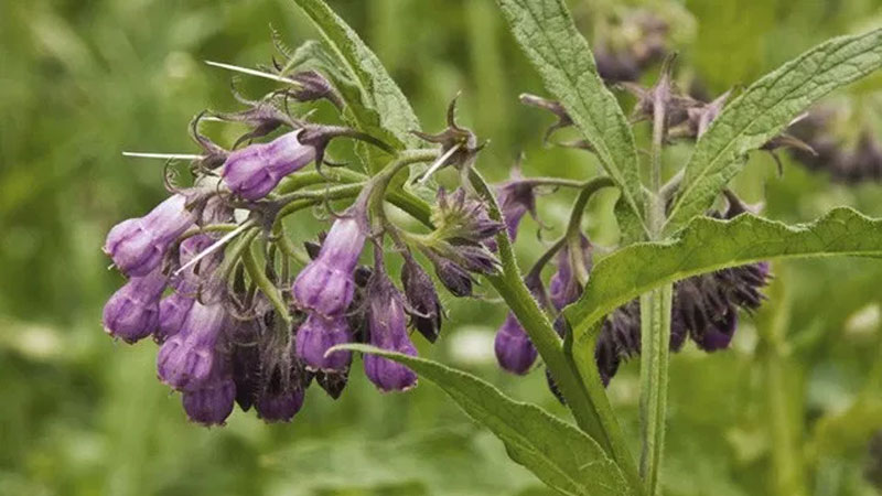 A hardy perennial, Symphytum officinale, whose leaves and roots and oil can be obtained. The oil is used in ointment form to promote wound heeding. Because it contains known liver toxins, comfrey is not recommended for use in tea and should not be taken internally.