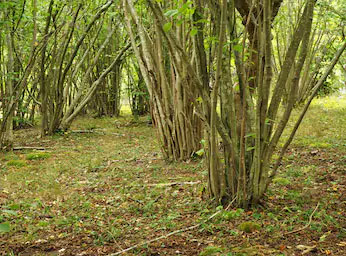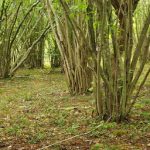 (Noun) vegetation in which trees or shrubs are regularly cut to ground level, but resprout after cutting.