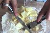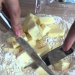 To incorporate solid fat in dry ingredients until finely divided by using a cutting motion with two knives or a chopping motion with a pastry blender.