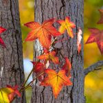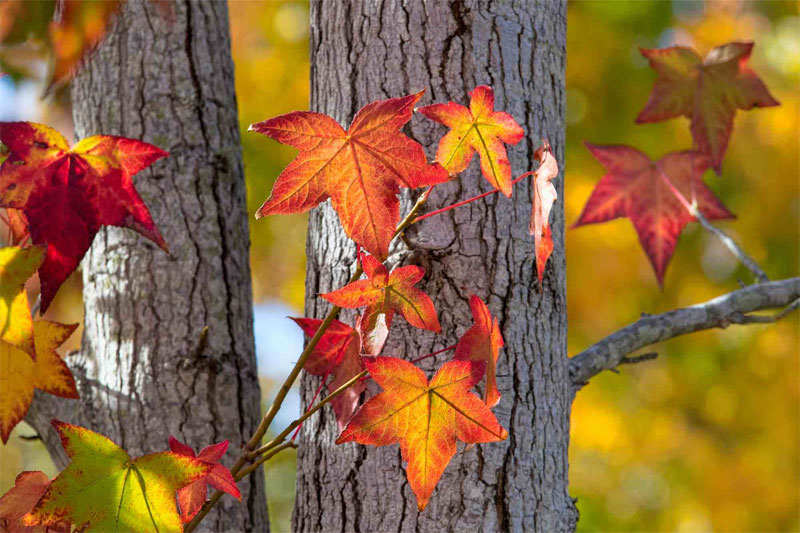Losing all the leaves each year, growing a fresh set later. Typically the leaves are shed in the fall, sometimes assuming brilliant colors before they do so, and new leaves grow in spring. Many tropical trees drop at any time of the year in anticipation of a prolonged dry season. A tree that doesn’t drop all its leaves is called semi-deciduous.