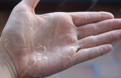 The process of skin flaking or peeling off. In cases of arsenic poisoning, the top layer of the skin may completely shed, leading to a cloud of skin flakes falling to the ground when clothes are removed. A more subtle form of this skin shedding can also occur after an illness like scarlet fever.