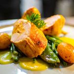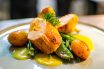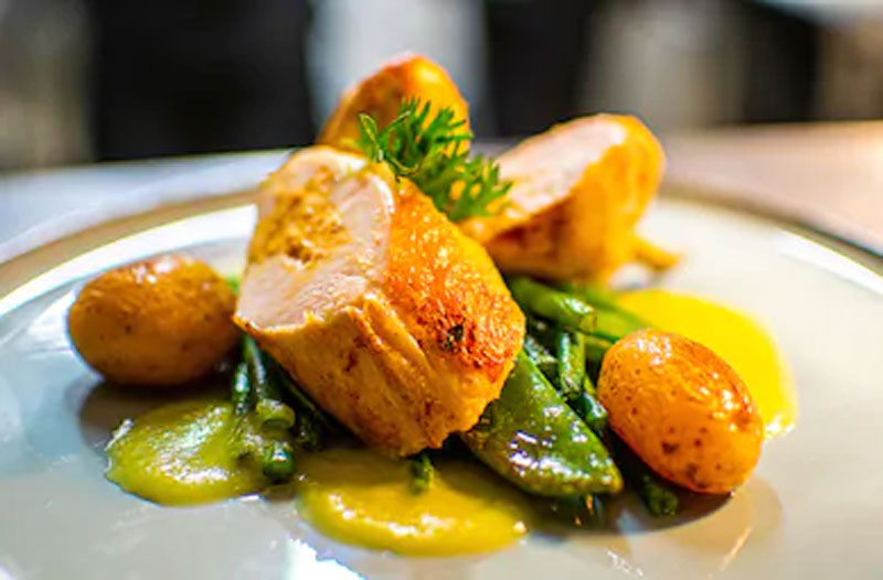 An entrée, typically made with meat, poultry, game, fish, eggs, or vegetables, that is served with a sauce and garnish, and can be served either hot or cold. Examples of entrées include cutlets, fillets, croquettes, and quenelles.