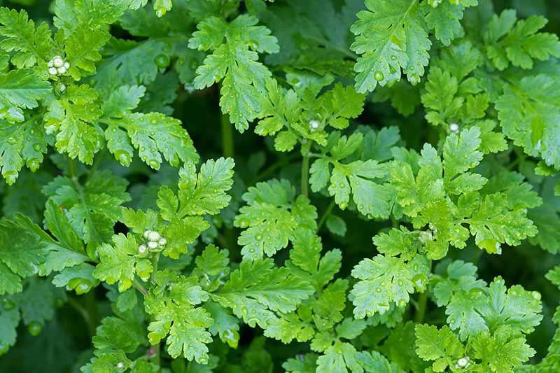Leaves from the Chrysanthemum parthenium, a member of the daisy family.