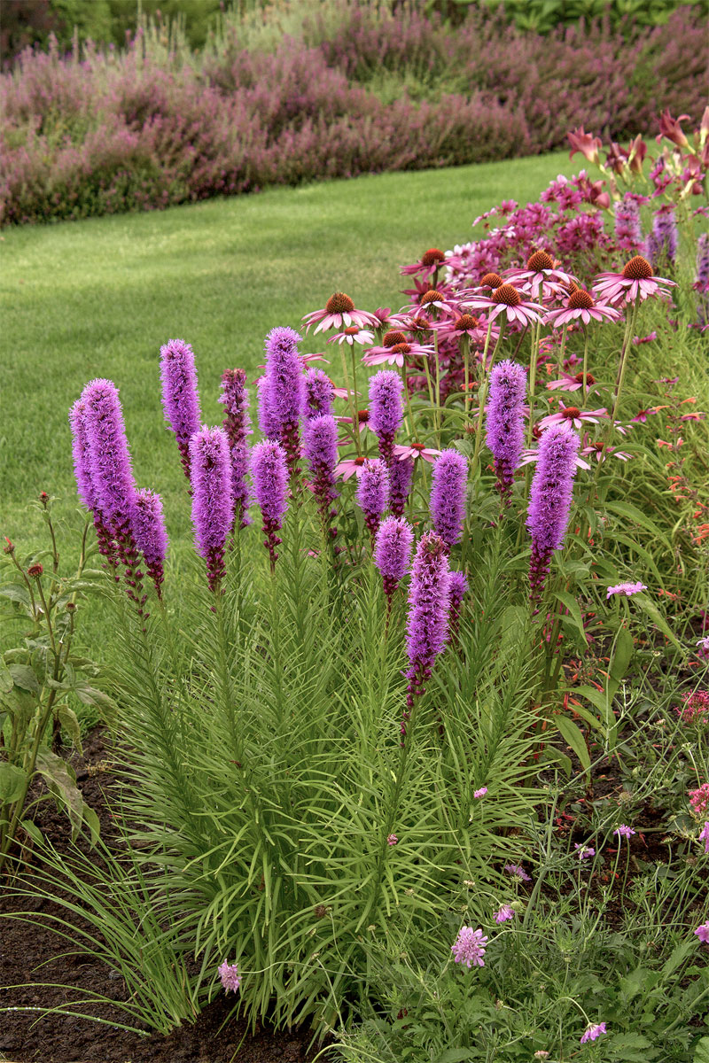 Features strong spikes of deep rosy-purple flowers. Tuberous roots make a soothing tea valuable in kidney diseases or as a gargle for sore throat. Gayfeather also known as Liatris spicata.